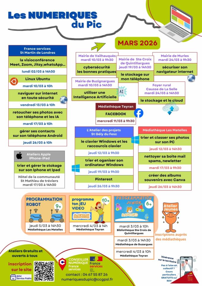 Les Numériques du Pic vous proposent leurs ateliers numériques pour le mois de mars 2026