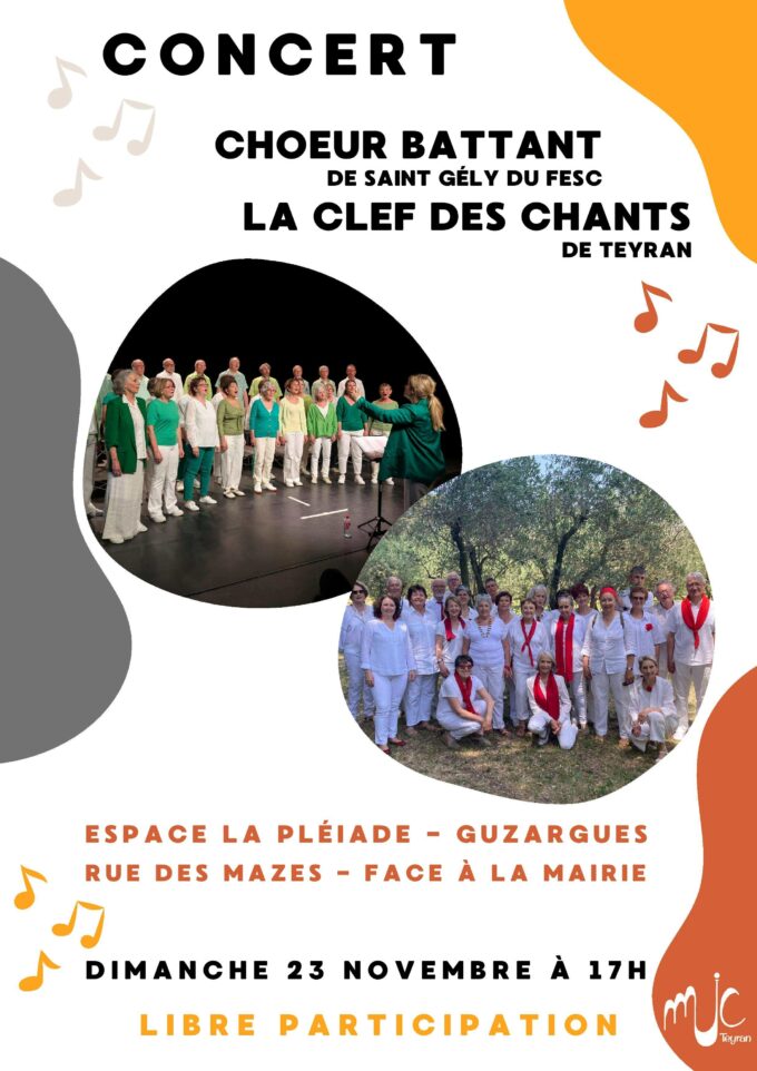 Les chorales Choeur Battant de St Gely du Fesc et La clef des Chants de Teyran vous donnent RDV dimanche 23 novembre à 17h à l’Espace La Pléiade. 60 choristes vous proposeront un répertoire varié : chansons françaises, pop/rock, chansons du monde, classique, jazz. Pour en savoir plus sur le répertoire
