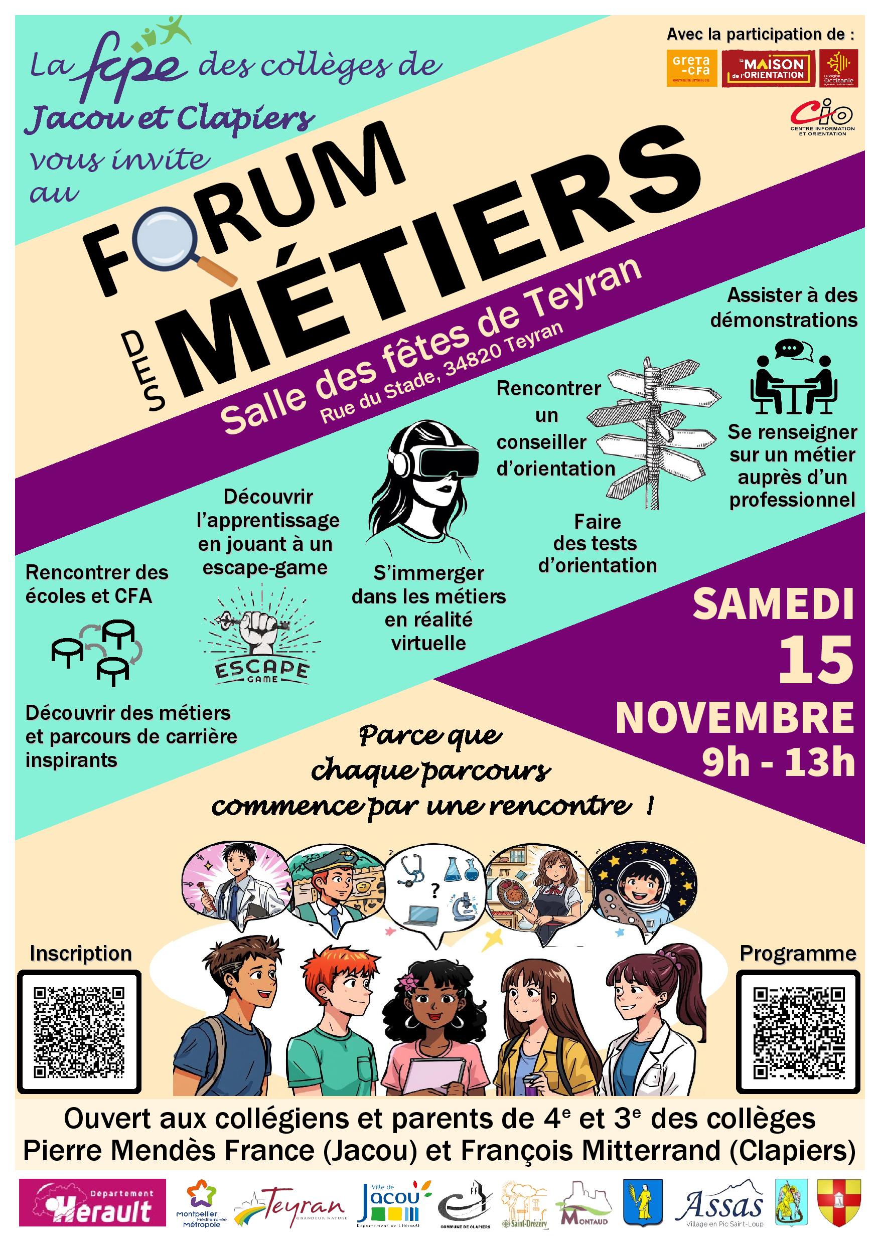Pour les collégiens de 4ème et 3ème : Forum des métiers le 15 novembre à Teyran Samedi 15 novembre 2025 09h00-13h00