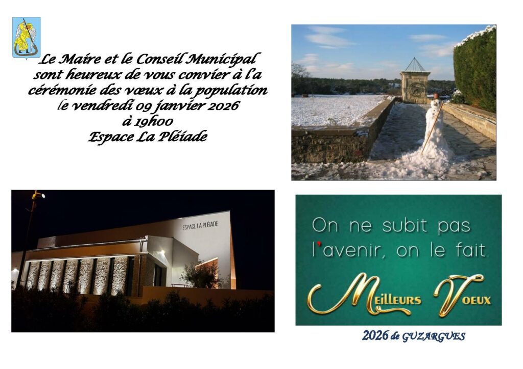 Le maire et le conseil municipal ont le plaisir de vous convier aux vœux de la nouvelle année le vendredi 9 janvier 2026 à 19h – Espace La Pléiade.
